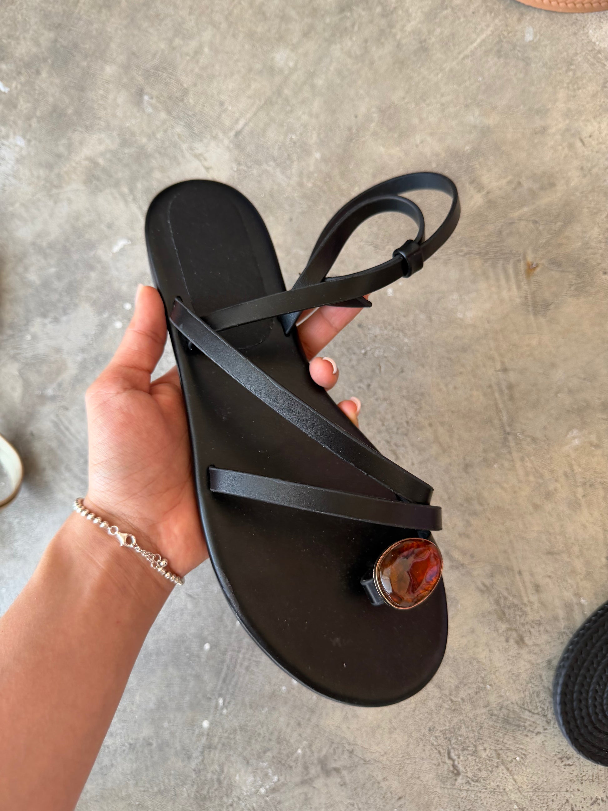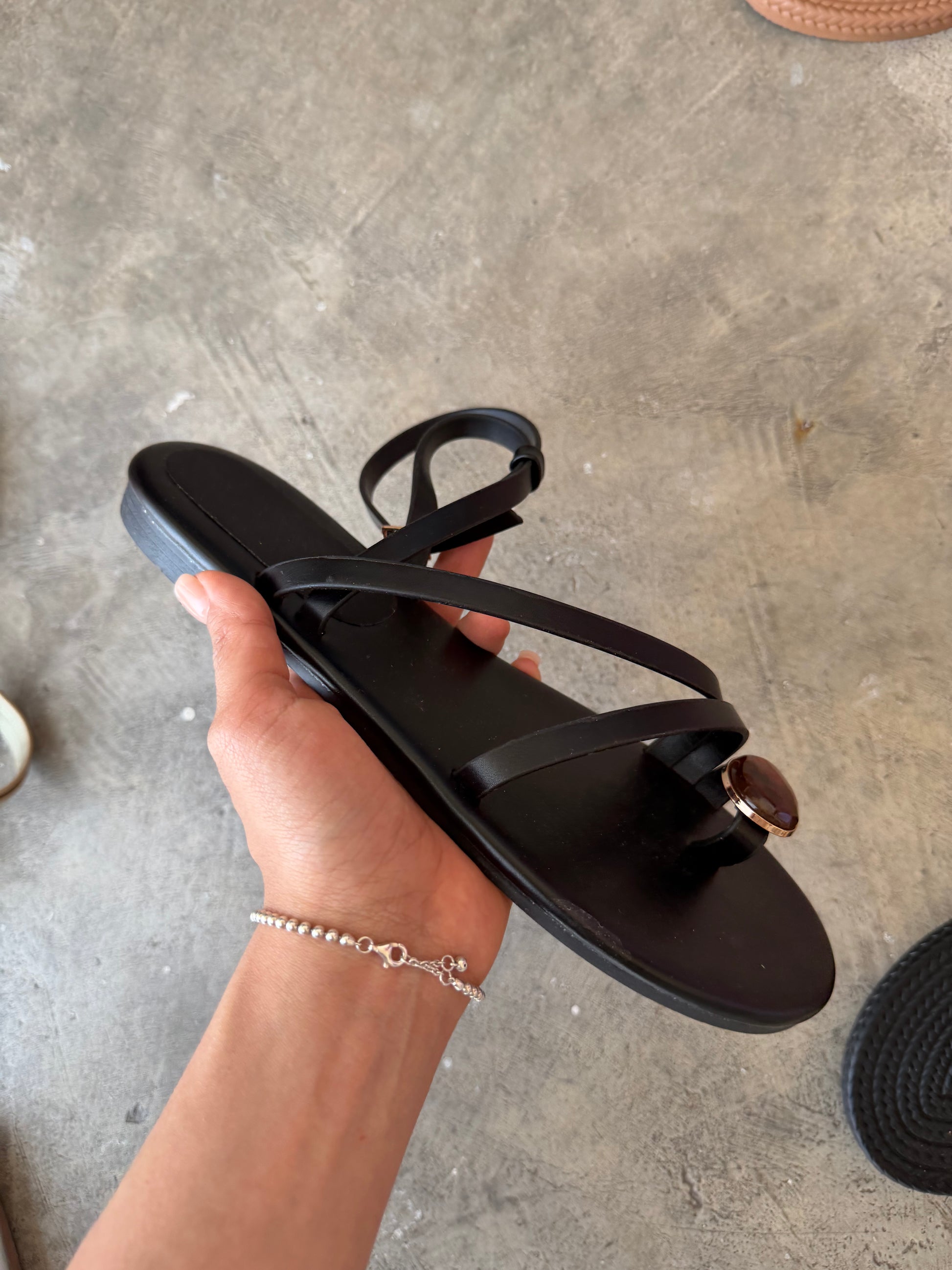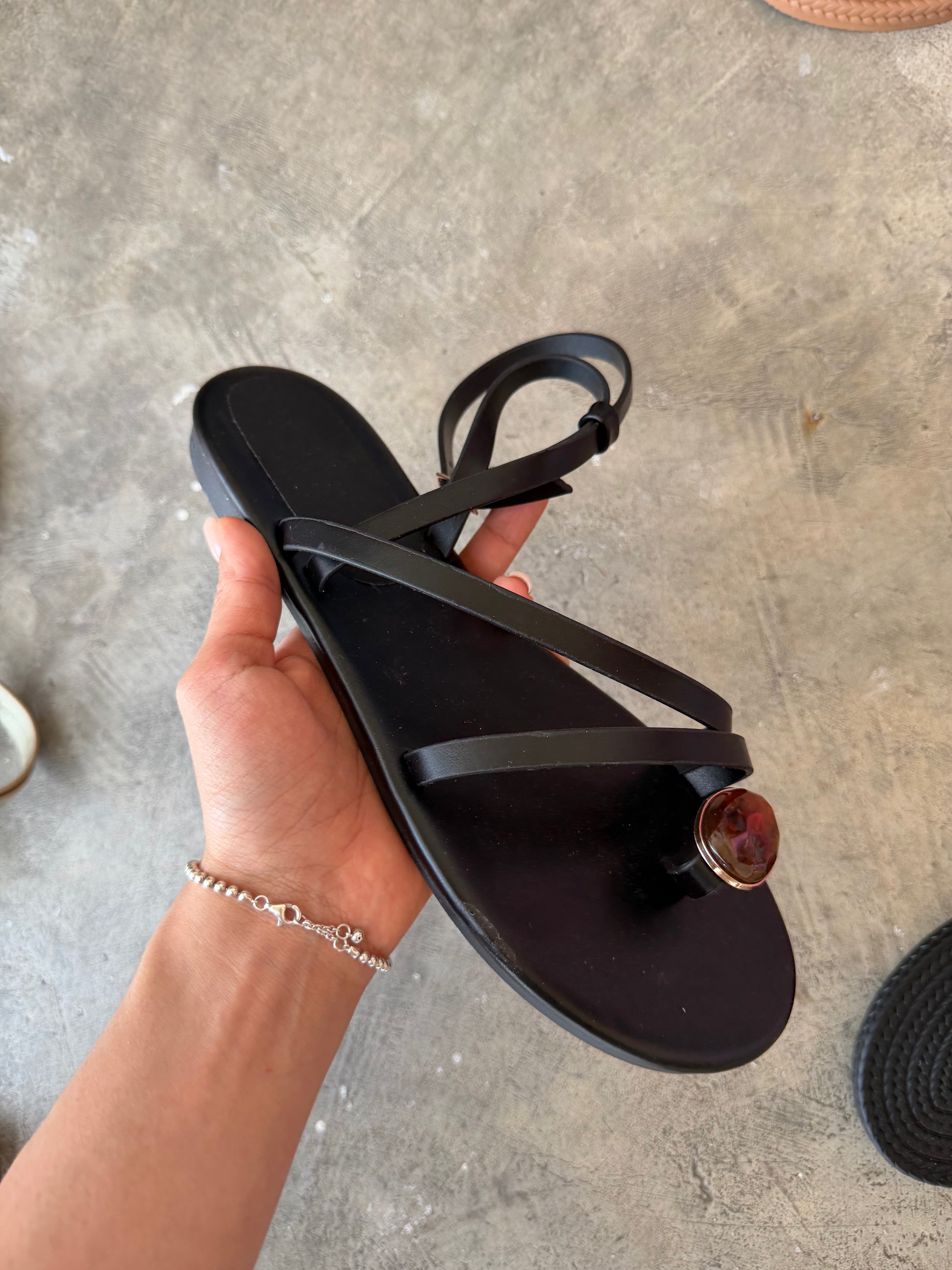 Sandalia tiras cruzadas con aplicación piedra, suela plana, cómodo y suave, calza en su punto